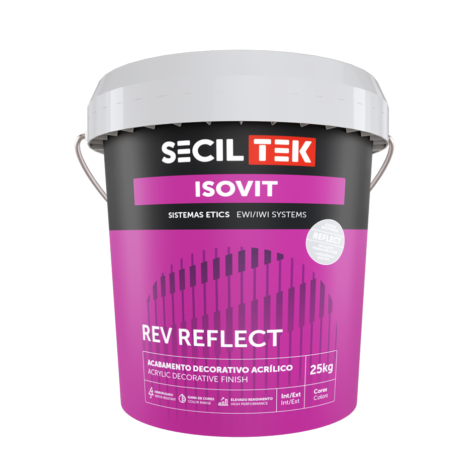 O ISOVIT REV REFLECT é um revestimento 100% acrílico, aditivado com resinas de siloxano, granulados de mármore e com proteção contra o desenvolvimento de fungos e algas, pigmentos especiais de baixa absorção de radiação solar.